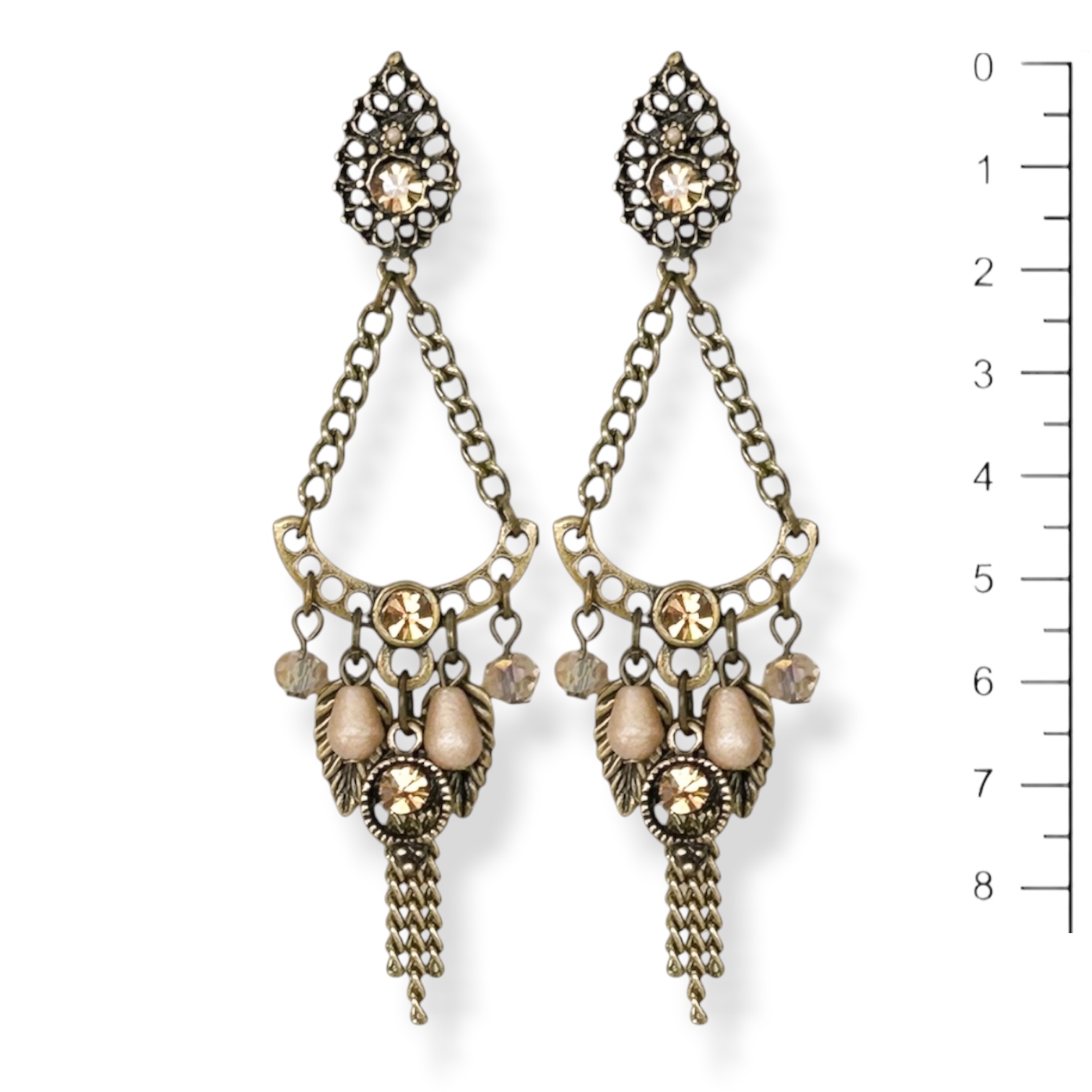 Brinco arco c/ correntes, folhinhas e ptos de luz bege e dourado - 12823