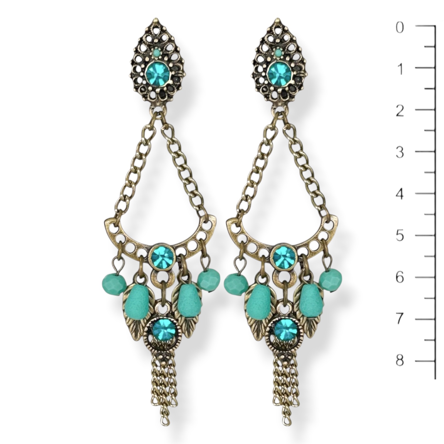 Brinco arco c/ correntes, folhinhas e ptos de luz turquesa - 12826