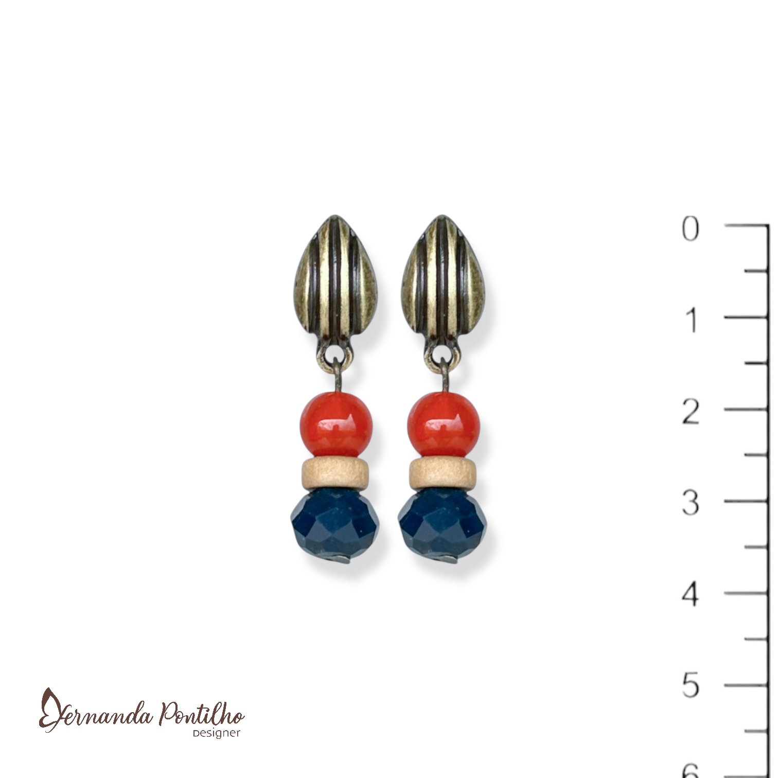 Brinco bola, disquinho e cristal - marinho, bege e terracota 12606