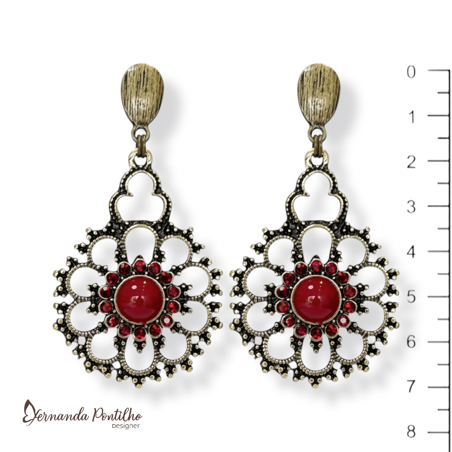 12667 Brinco flor c/ pedra de resina e strass vermelho