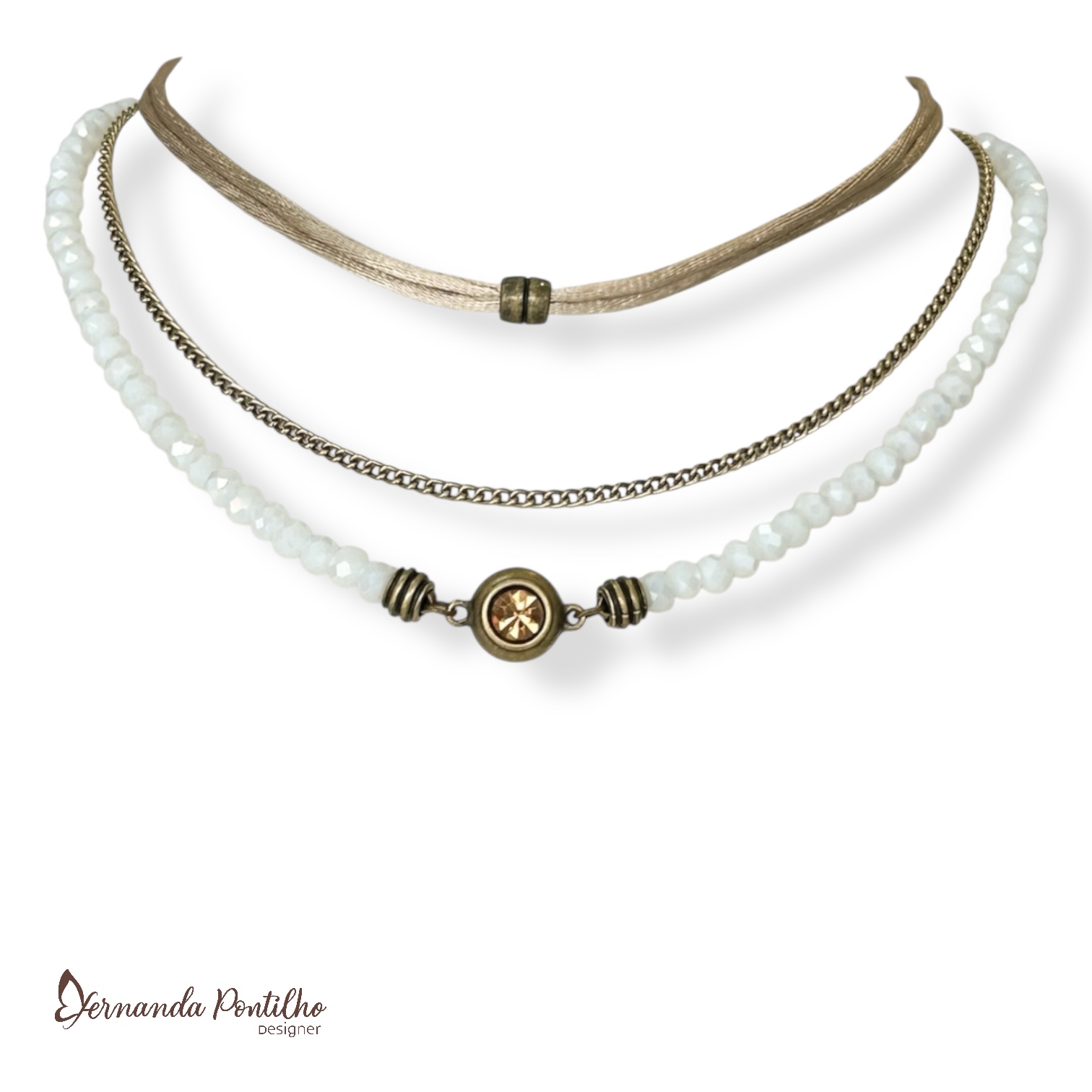 12689 Chocker 3 voltas c/ cordão, corrente, cristais e pto de luz - branco e dourado