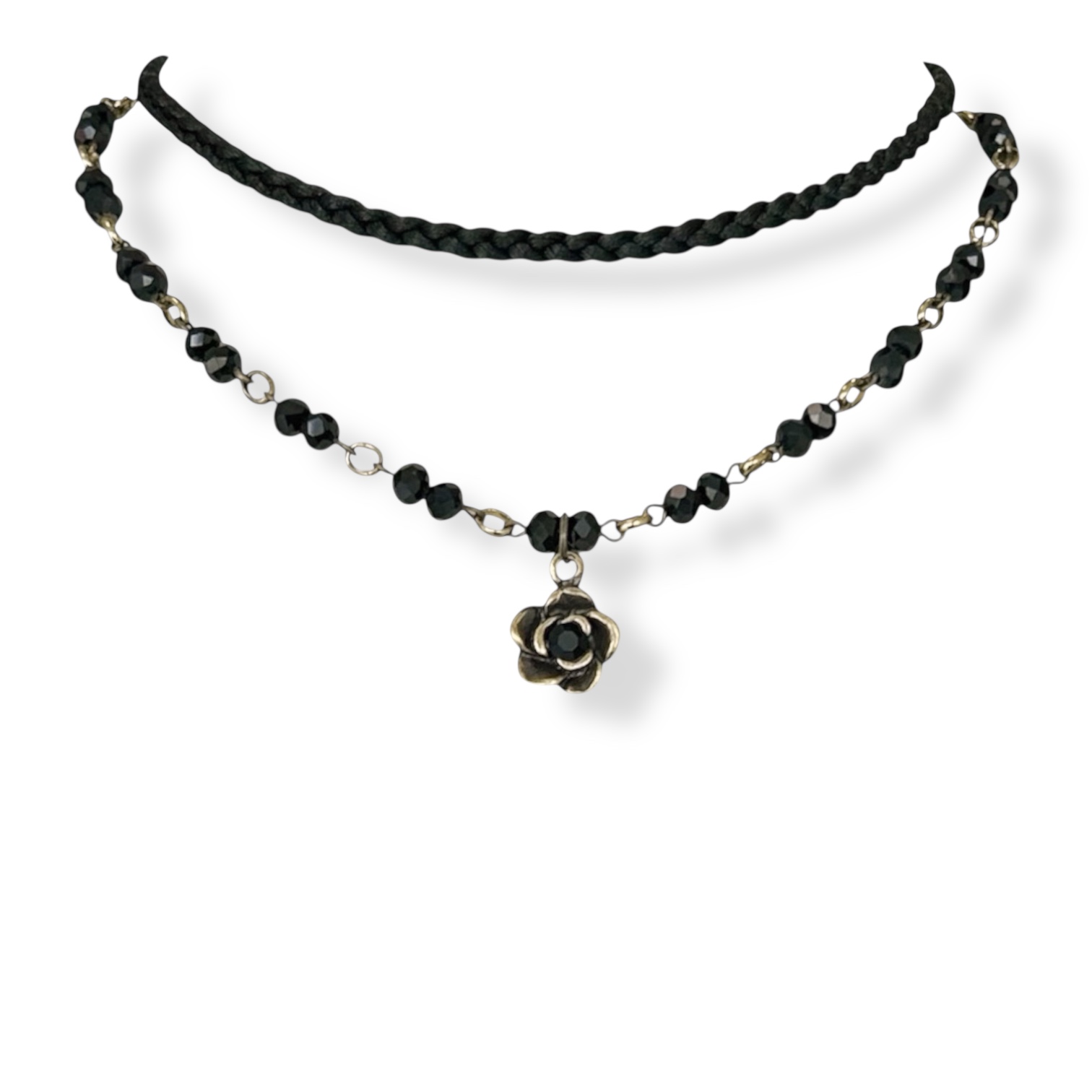 Choker 2 voltas c/ trança, cristais e rosinha c/ strass - preto 12779