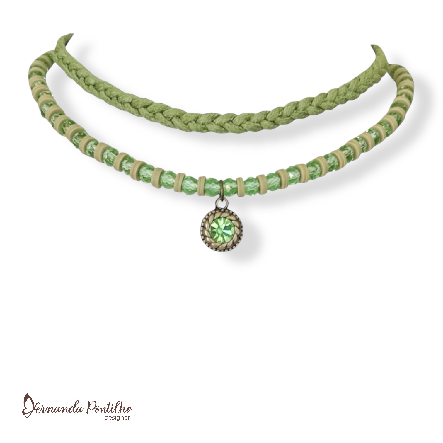 12672 Choker 2 voltas c/ trança de cordão, cristais e pto de luz - verde