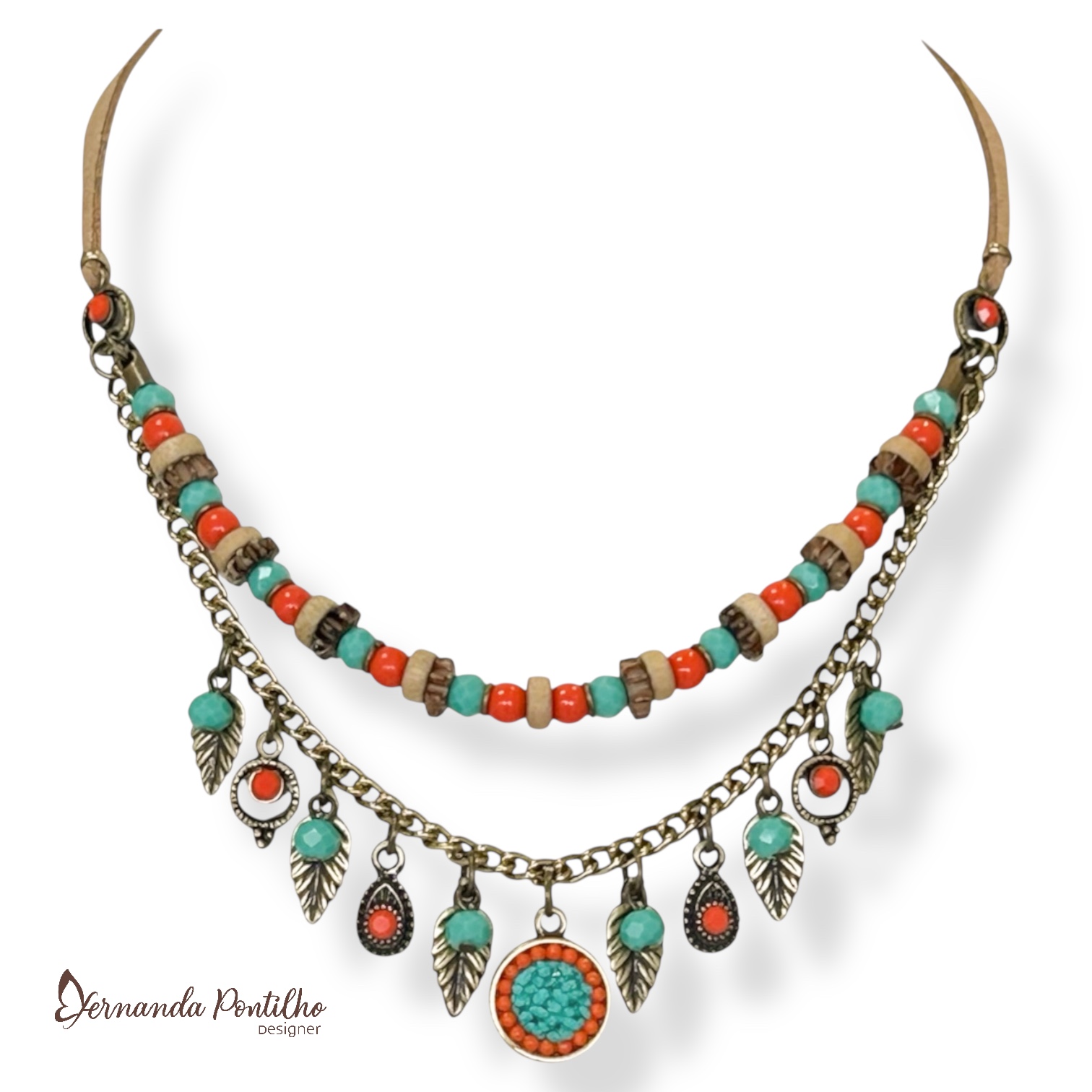 Colar curto 2 voltas c/ contas e berloques - coral e turquesa 12729