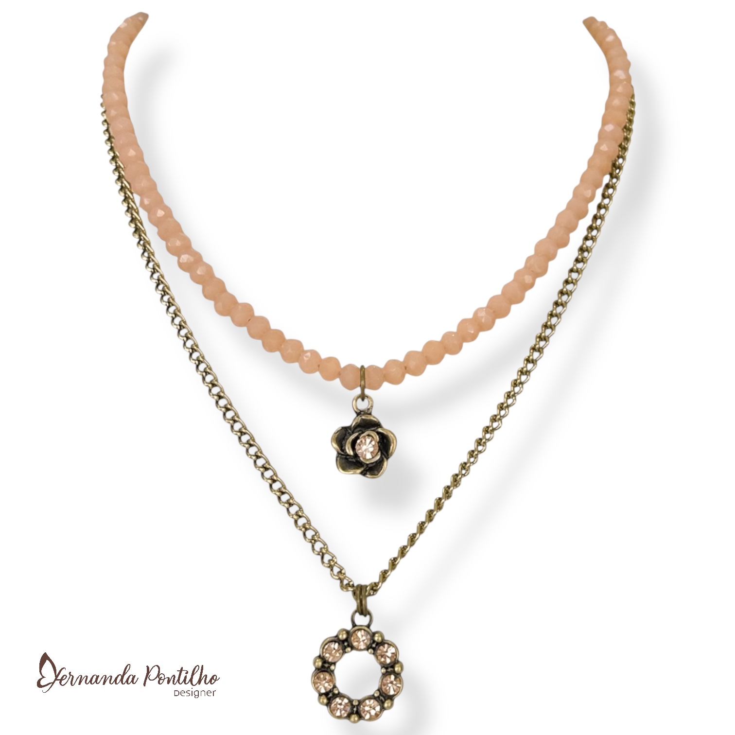 Colar curto 2 voltas c/ cristais, corrente e berloques de strass - salmão 12755