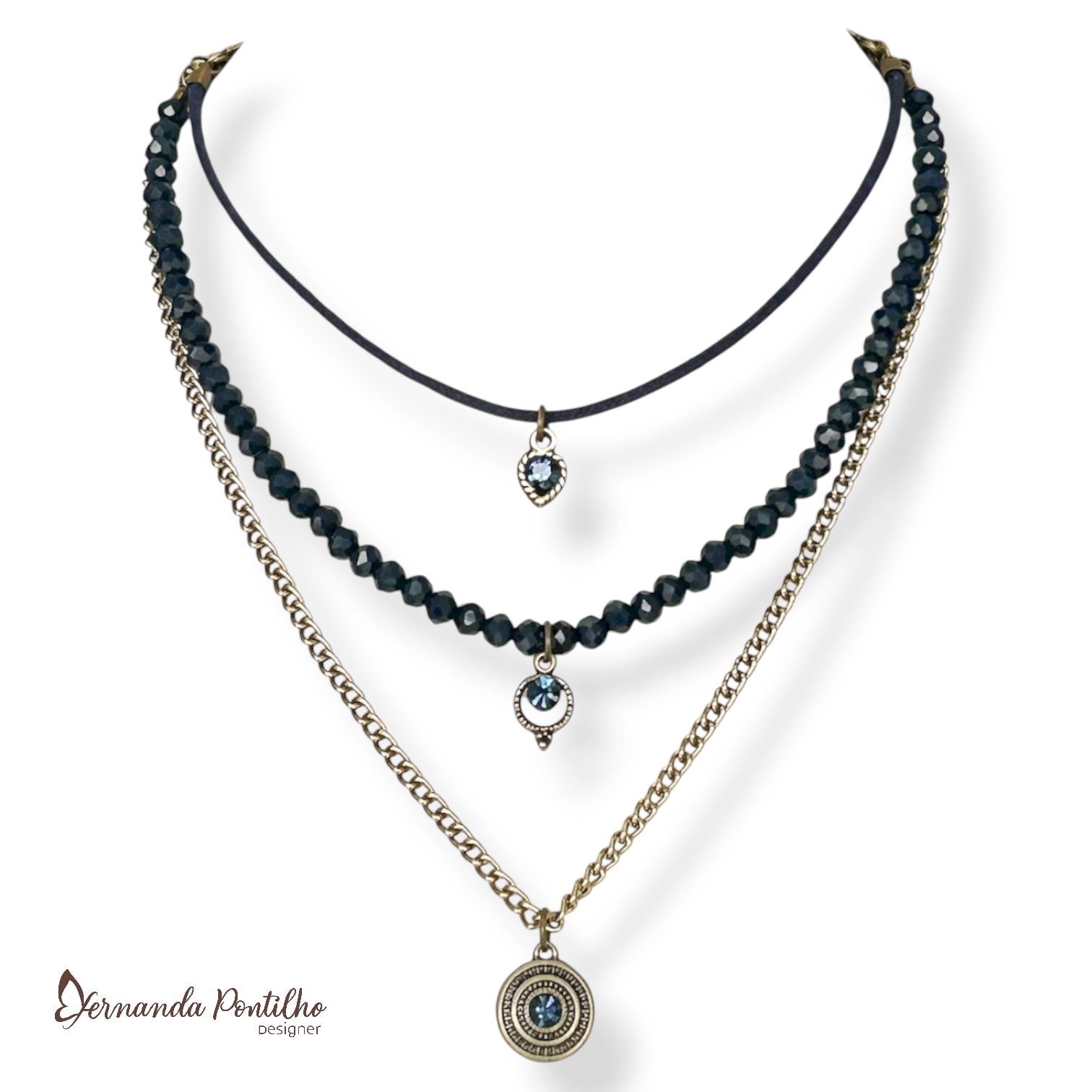 12064 COLAR CURTO 3 VOLTAS C/ CRISTAIS E BERLOQUES AZUL MARINHO