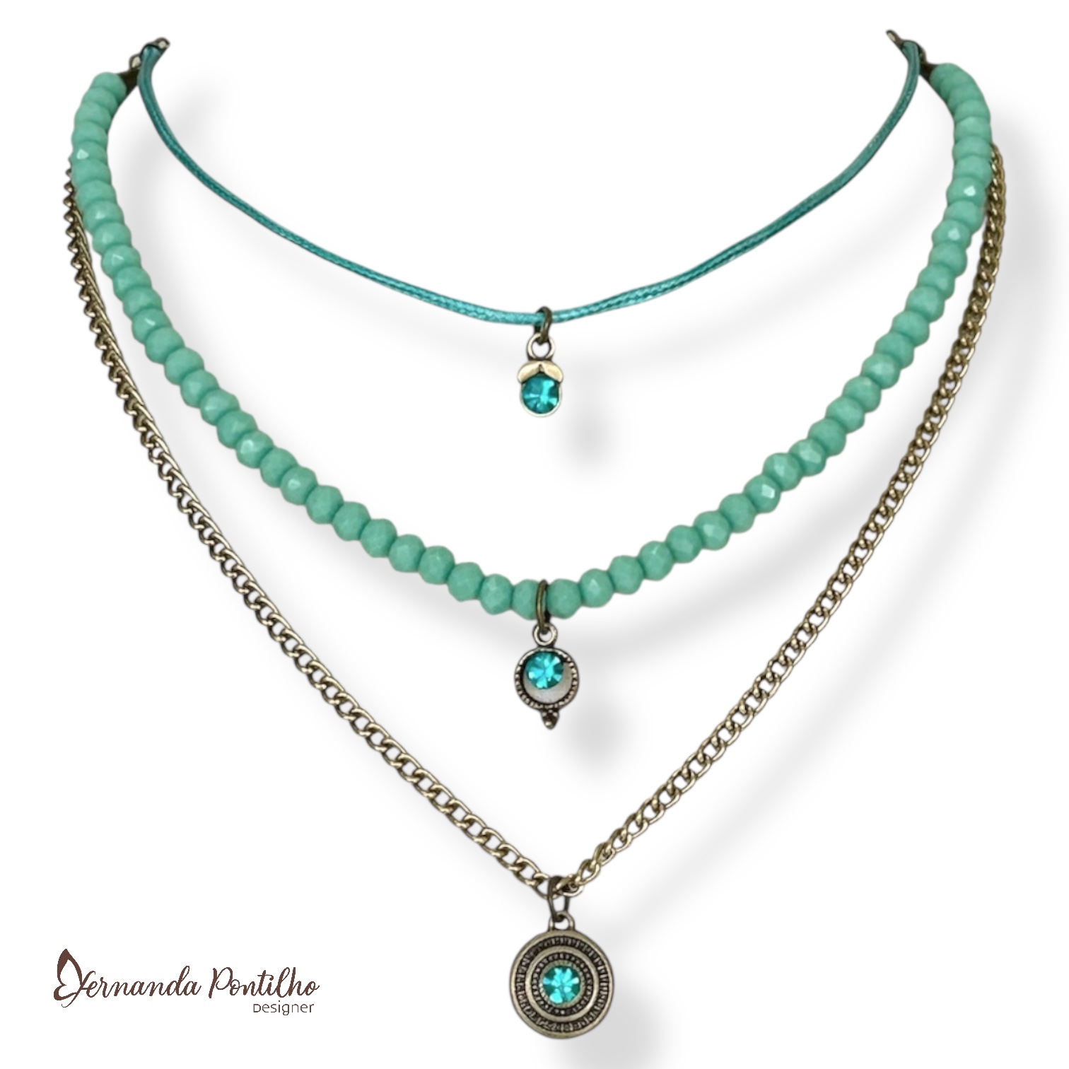 11589 COLAR CURTO 3 VOLTAS C/ CRISTAIS TURQUESA