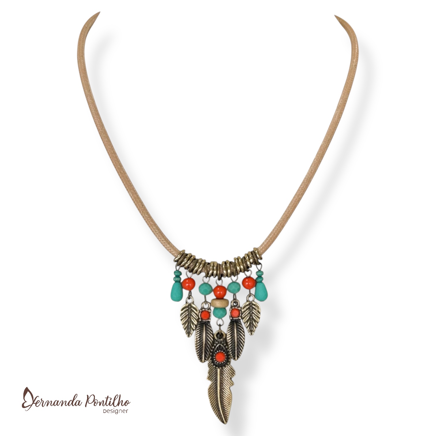 Colar curto c/ cordão, cristais, contas e folhinhas - coral e turquesa 12766