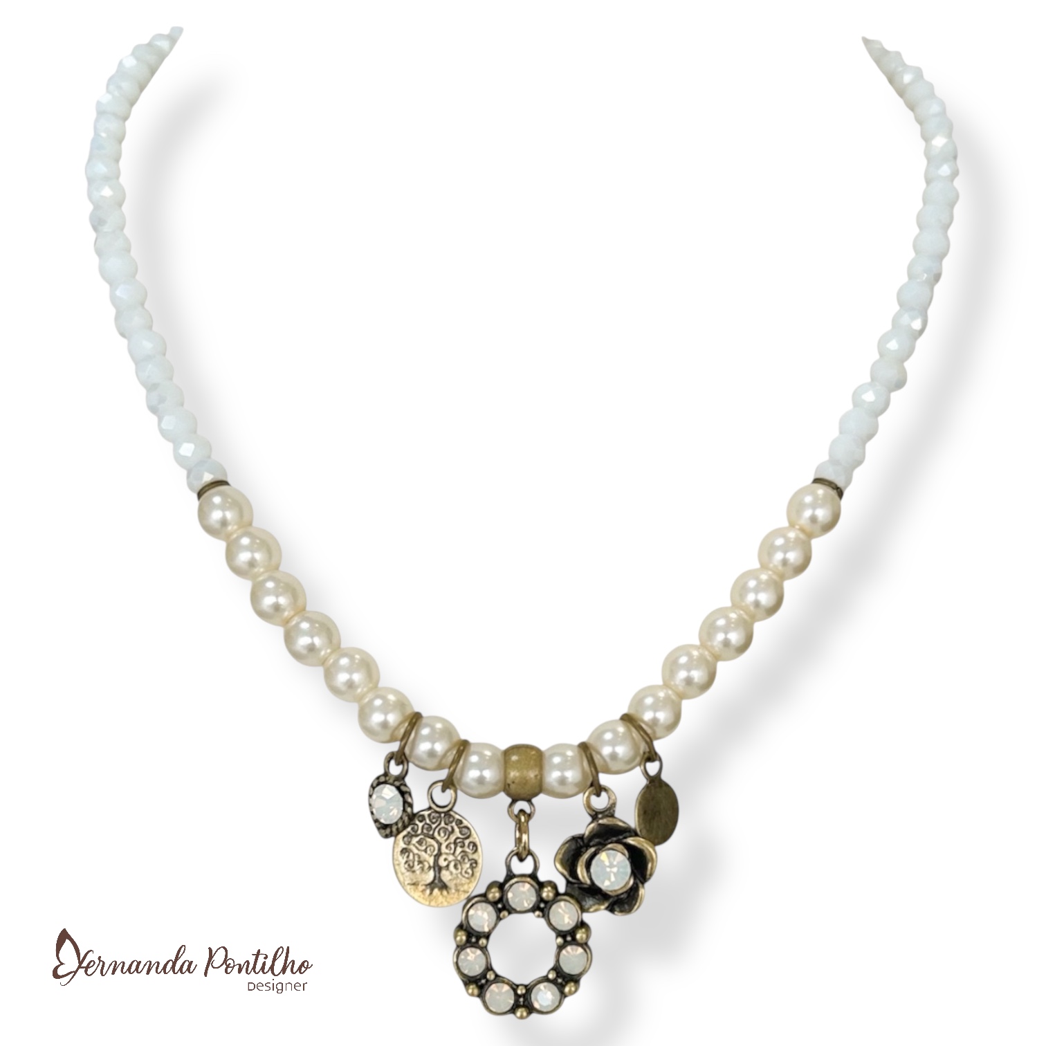 Colar curto c/ cristais, pérolas e berloques de strass - branco e pérola 12774
