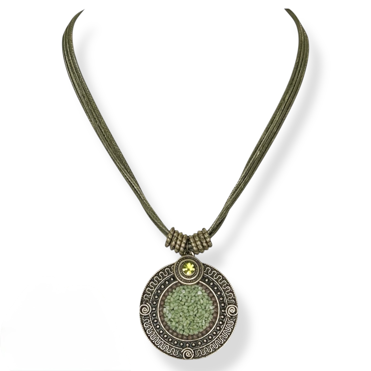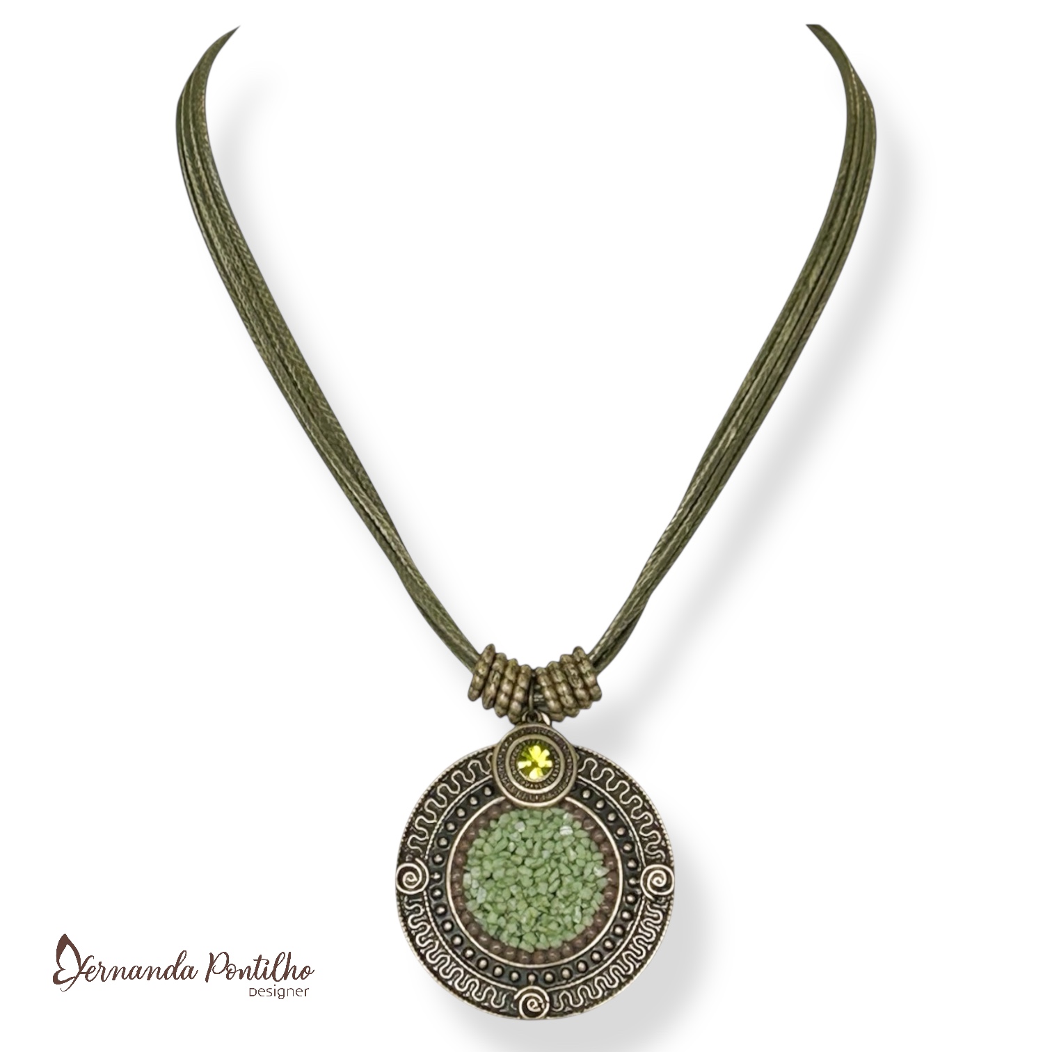 Colar curto c/ cordão, mandala c/ cascalho e pto de luz - verde oliva 11880