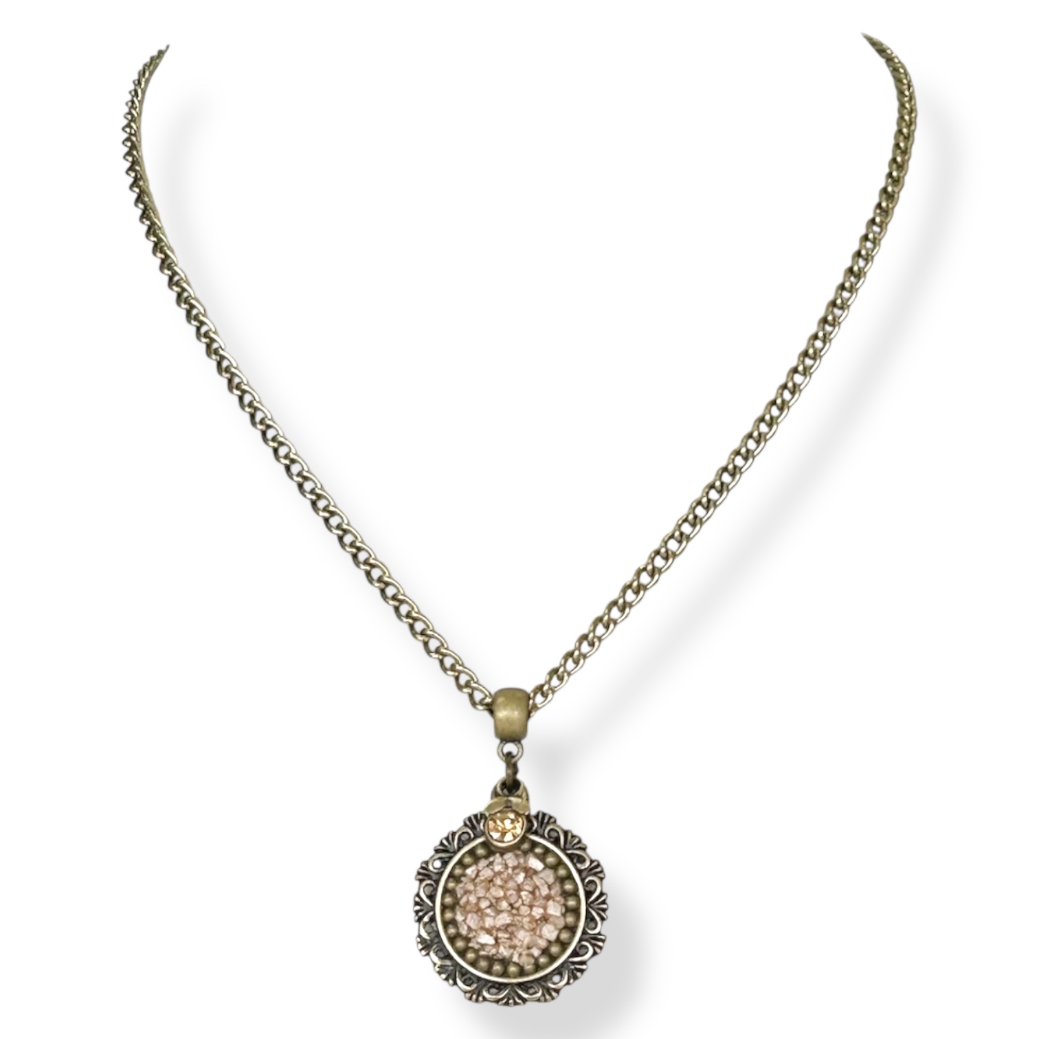 Colar curto corrente e mandala c/ cascalho e pto de luz - bege e dourado 12834