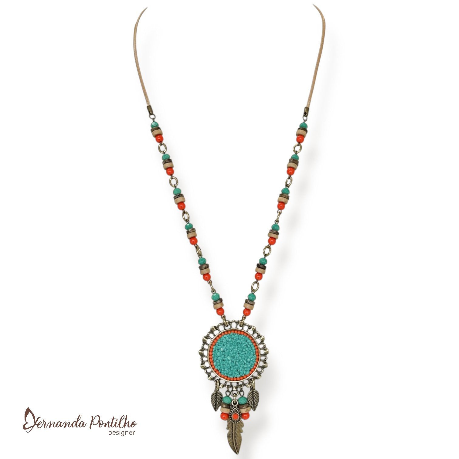 12727 Colar longo c/ contas, mandala customizada e berloques - coral e turquesa