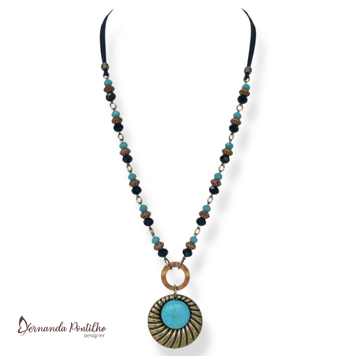 12682 Colar longo c/ cordão, cristais e mandala c/ pedra natural - marinho, turquesa e caramelo
