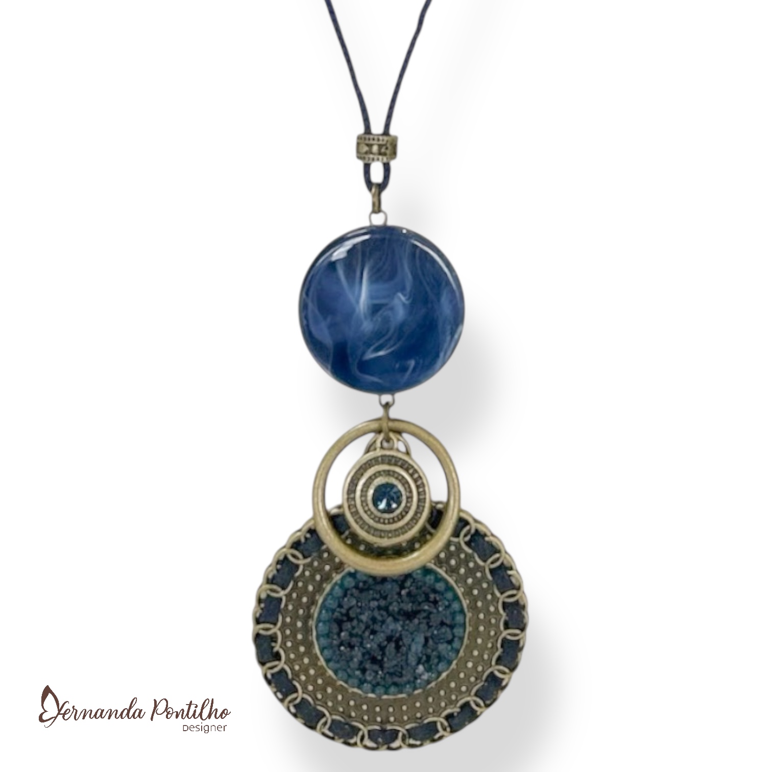 Colar longo c/ cordão, pedra de resina e mandala c/ cascalho - azul marinho 12764