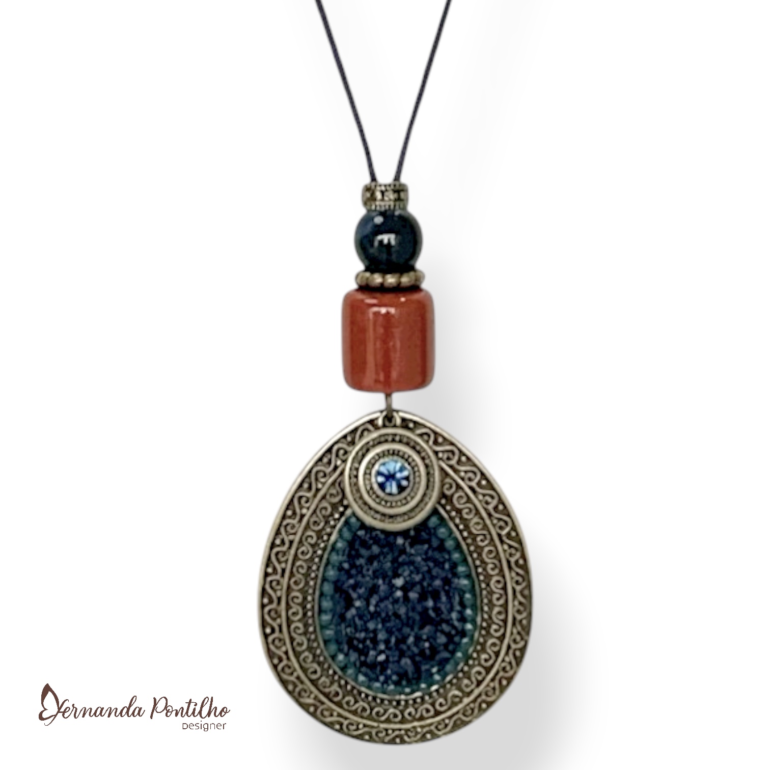 12724 Colar longo c/ cordão, resinas e gota customizada - azul marinho e terracota