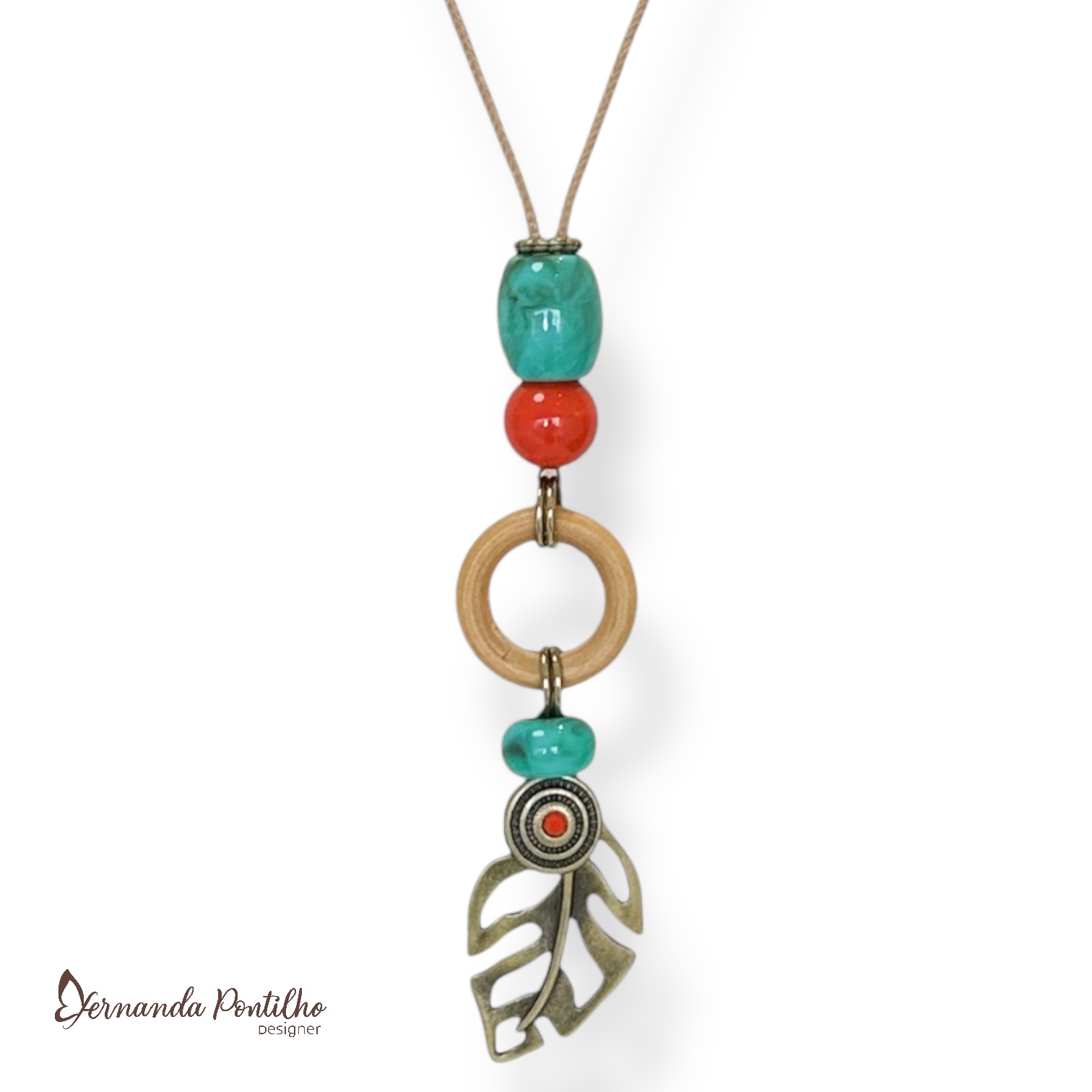 Colar longo c/ cordão, resinas, madeira e folha costela de Adão - coral e turquesa 12768