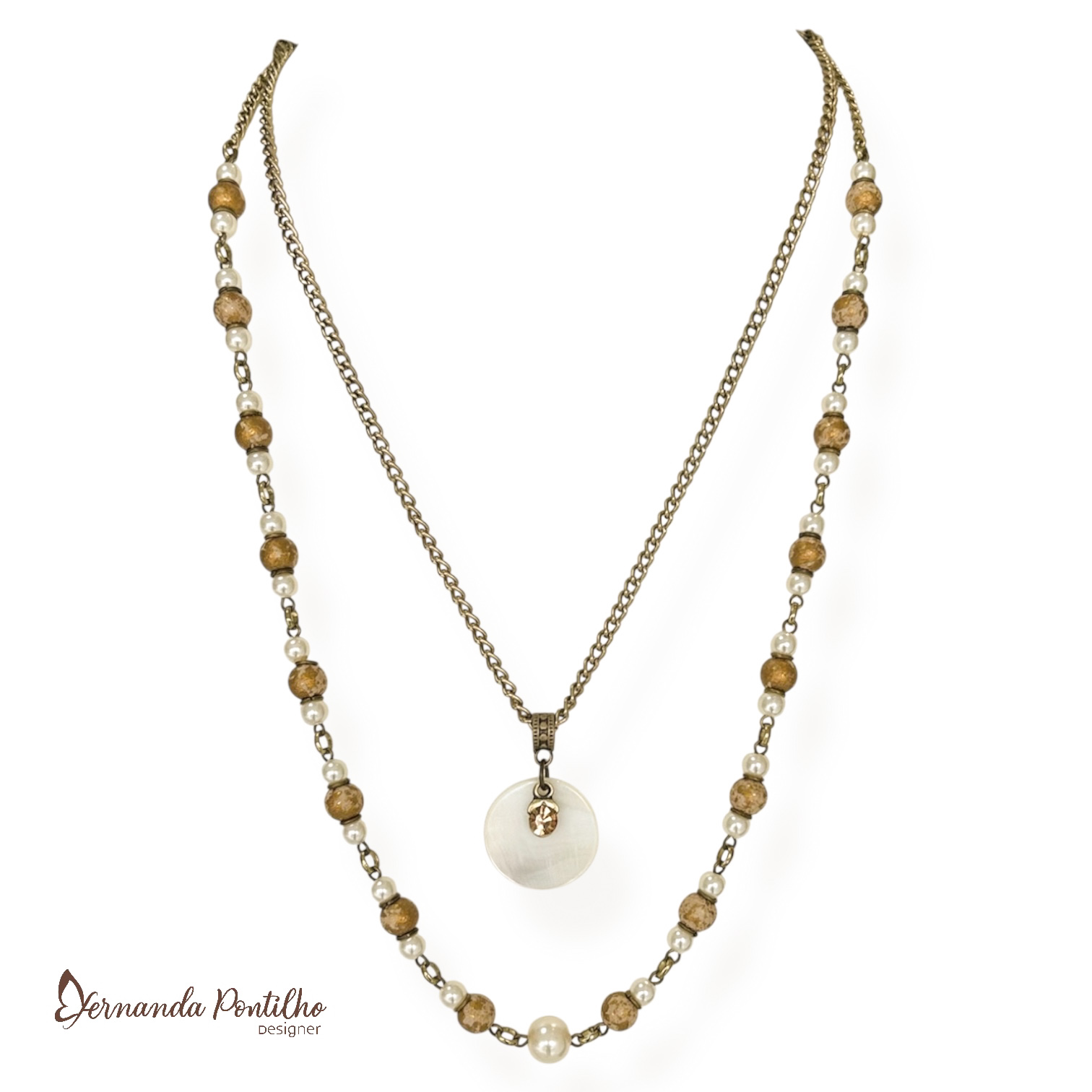 12697 Colar médio 2 voltas c/ bolas, ping. de madrepérola e pto de luz - branco, pérola e dourado