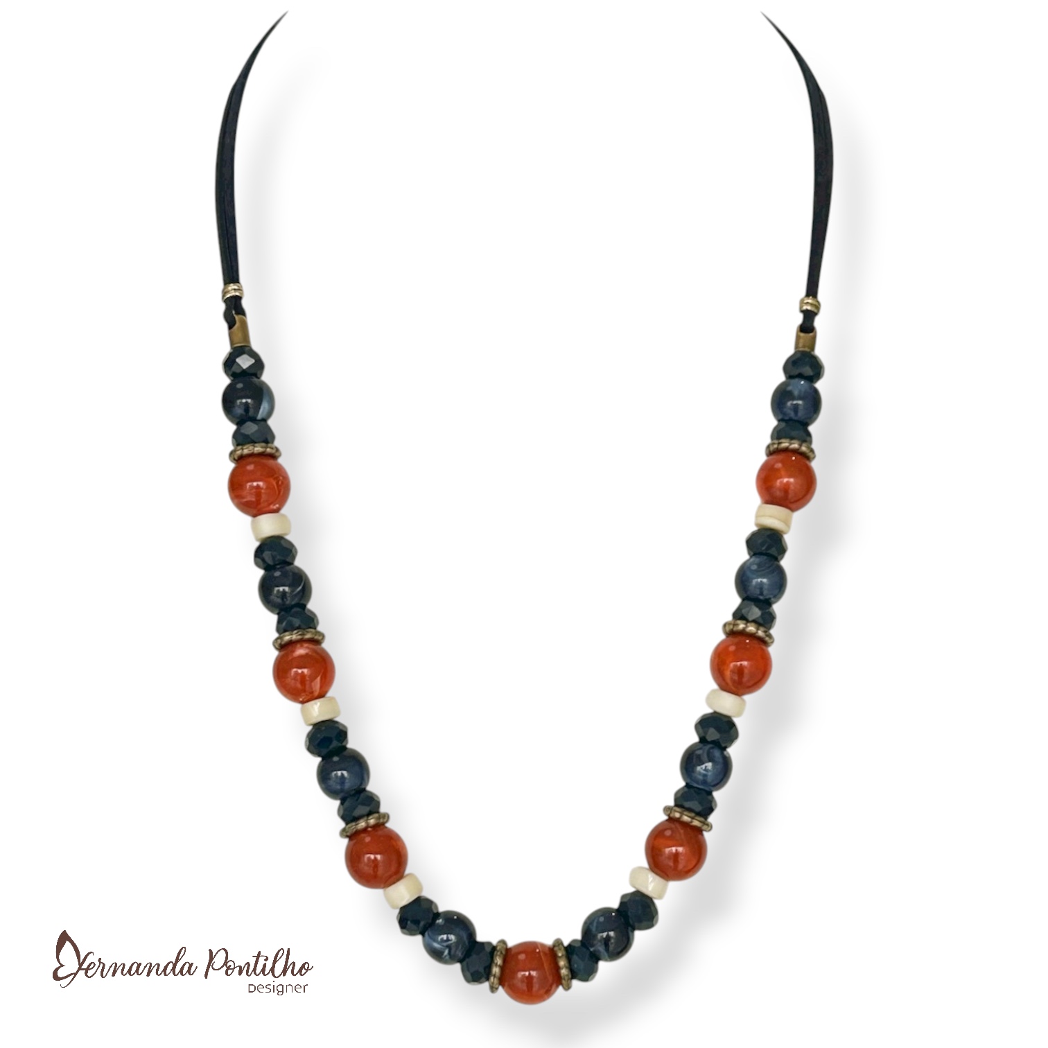 12713 Colar médio c/ cordão, bolas e cristais - marinho, off e terracota