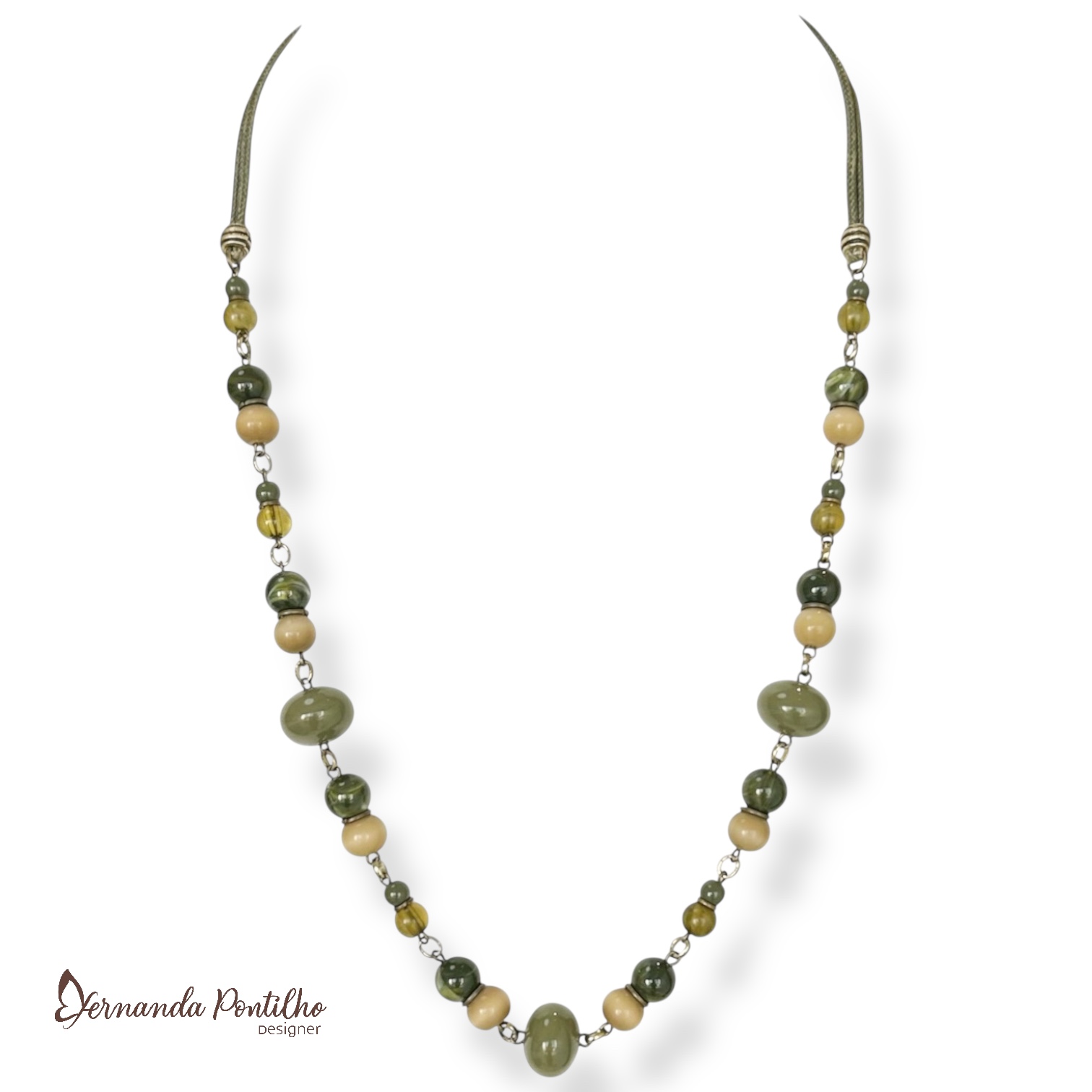 12701 Colar médio c/ cordão, bolas e entremeios verde oliva 12701