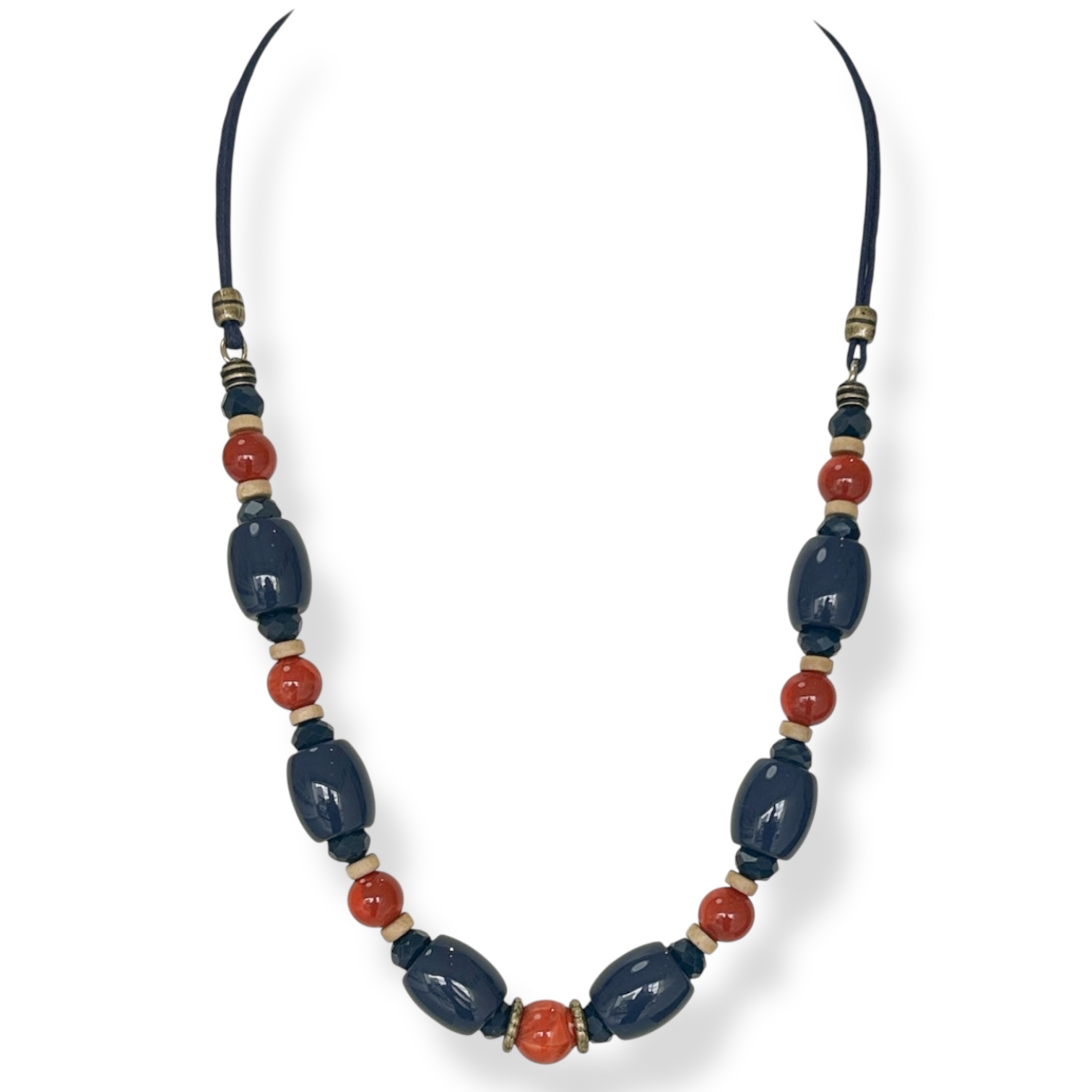 Colar médio c/ cordão, cristais, bolas e tubos - marinho, bege e terracota 12797