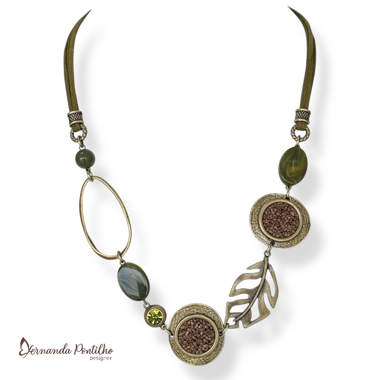 12639 Colar médio c/ cordão, resina, costela de Adão, argola oval, pto de luz e chapas c/ cascalho - verde oliva e marrom