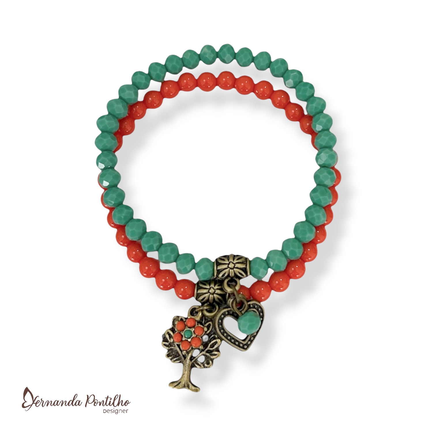 12717 Kit 2 pulseiras de cristais, bolas e berloques - coral e turquesa