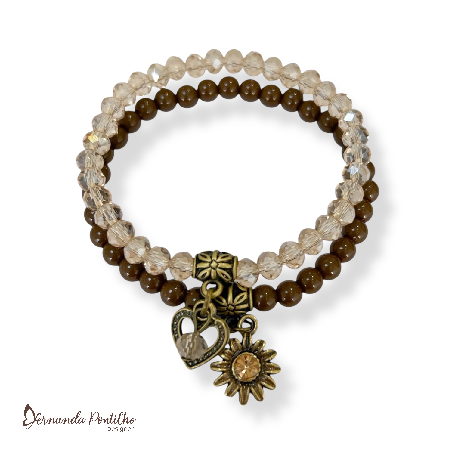 Kit c/ 2 pulseiras de bolas, cristais e berloques - Marrom 12763