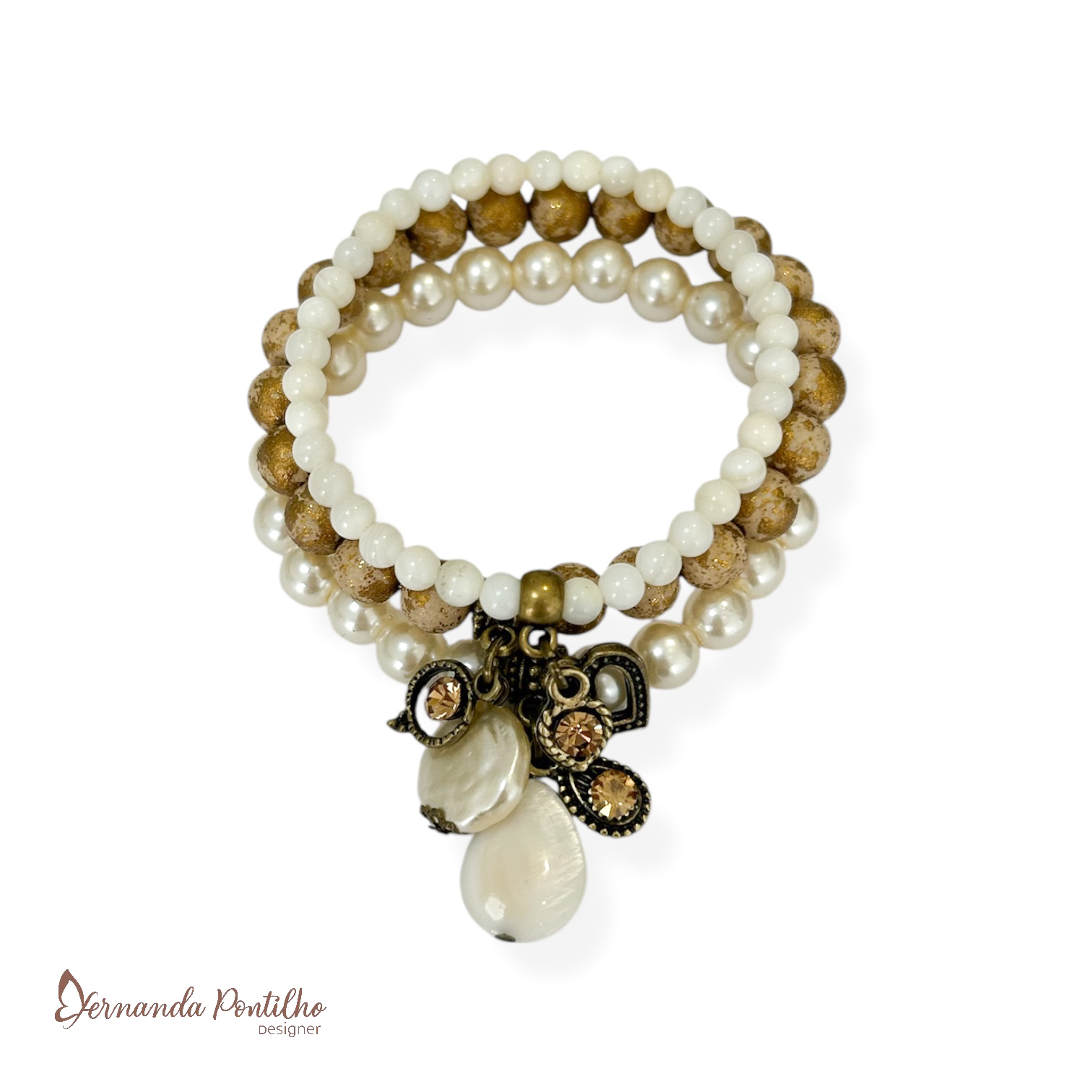 12695 Kit c/ 3 pulseiras de bolas, madrepérolas e berloques - pérola e dourado