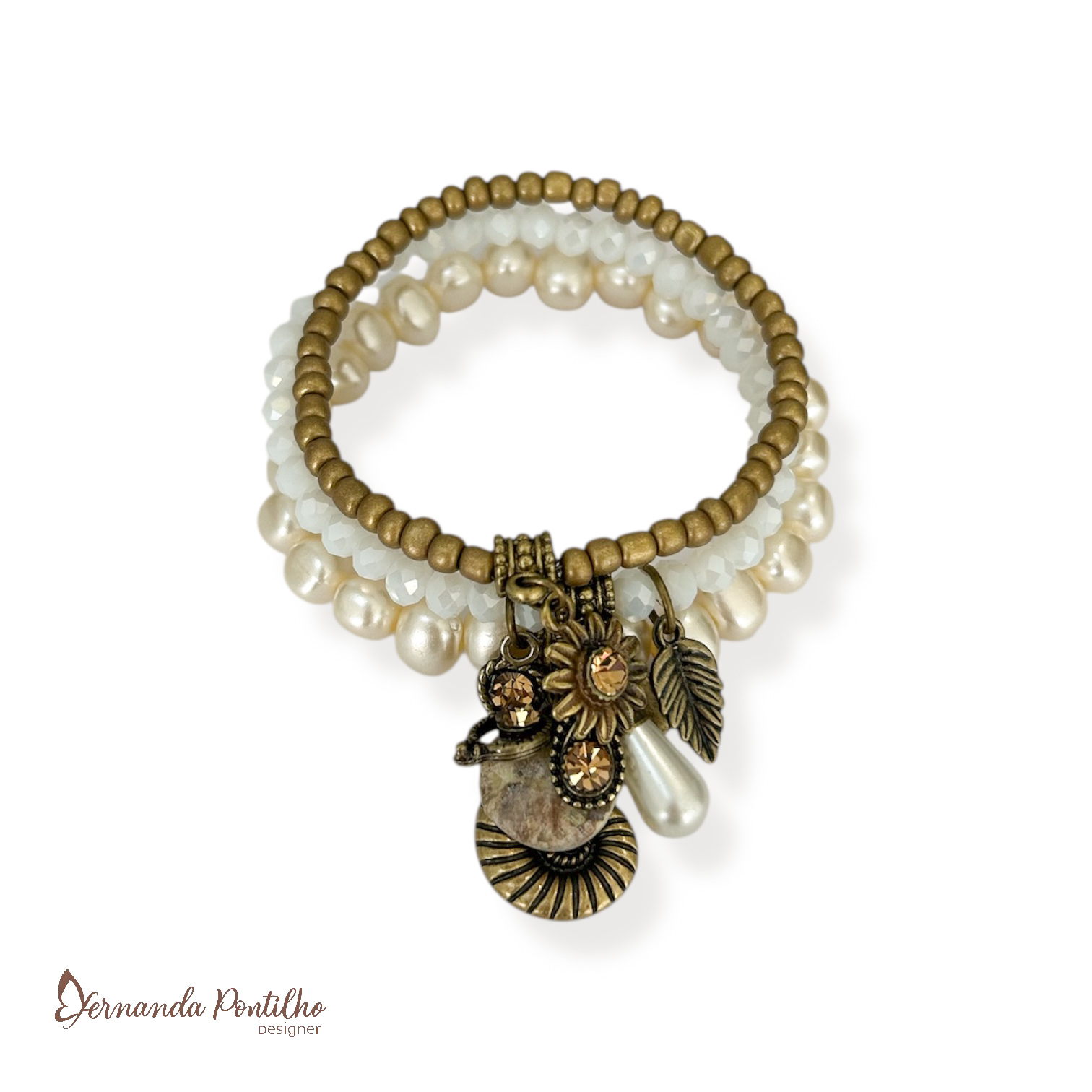 12716 Kit c/ 3 pulseiras de bolas, miçangas, cristais e berloques - branco, pérola e dourado